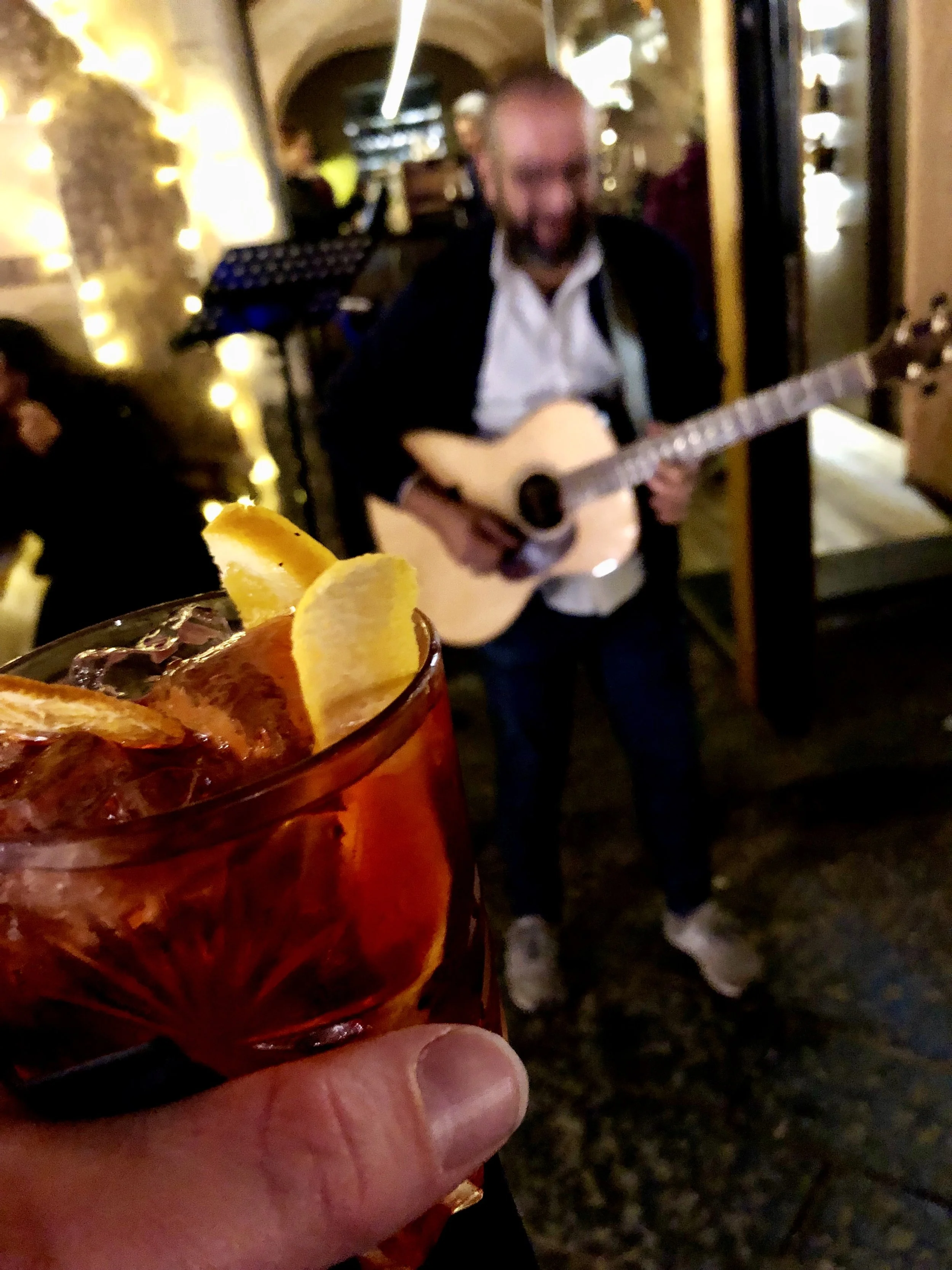 It was Friday night, so our timing couldn't have been better. The streets were alive with people, noise, energy. Energy that was recharging my system. Our restaurant, recommended by a friend, was a sprawling space spread across two interiors and the pedestrian street between them. A guitarist and saxophone combo lit up the night with sound and kept everyone swaying rhythmically as they sipped cocktails and consumed pizza.